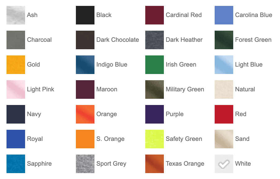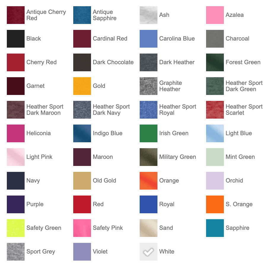 For CLASSIC and INDIANA style t-shirts, see the color options below. If you would like a WORKCAMP style long-sleeve t-shirt or sweatshirt, the shirt color must be Sapphire. Please provide $15 for each long-sleeve t-shirt you order and $20 for each sweatshirt you order (link below).